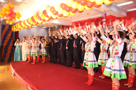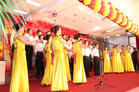 團(tuán)拜會(huì)的最后,公司員工一起合演《歌唱祖國》,喜慶的表演,整齊的著裝,人浪涌動(dòng),煙花閃爍,把整個(gè)活動(dòng)推向了高潮。