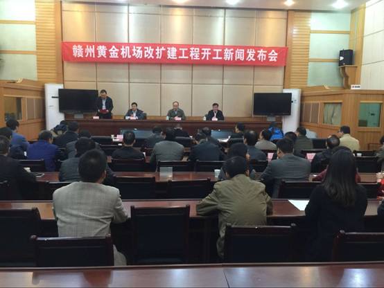 市政府召開(kāi)贛州黃金機(jī)場(chǎng)改擴(kuò)建工程開(kāi)工新聞發(fā)布會(huì)。圖為發(fā)布會(huì)現(xiàn)場(chǎng)。