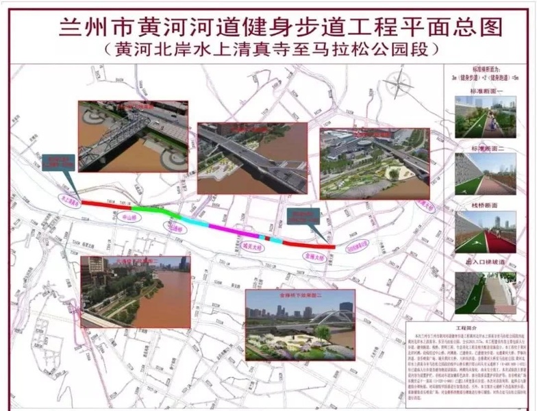 蘭州市黃河河道健身步道工程(黃河北岸水上清真寺至馬拉松公園段)位于黃河北岸河灘,全長2924.317米,西起黃河北岸金城關(guān)古建一條街水上清真寺,沿途經(jīng)過中山橋、元通黃河大橋、羅鍋溝洪道、音樂噴泉廣場、城關(guān)黃河大橋、大砂溝洪道、金雁黃河大橋至馬拉松公園。主要建設內(nèi)容包括人行步道、健身跑道、棧橋、照明工程、生態(tài)美化工程、相關(guān)配套設施及中山橋、元通大橋、金雁大橋下和音樂噴泉廣場節(jié)點景觀改造。