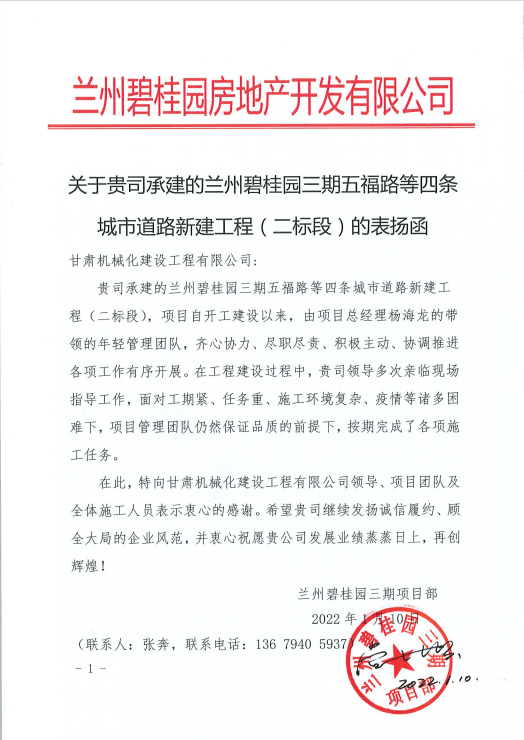 1月10日,我公司收到來(lái)自蘭州碧桂園房地產(chǎn)開(kāi)發(fā)有限公司的表?yè)P(yáng)函,函中提到,蘭州碧桂園三期五福路等四條城市道路新建工程(二標(biāo)段)項(xiàng)目自開(kāi)工建設(shè)以來(lái),項(xiàng)目人員面對(duì)工期緊、任務(wù)重、施工環(huán)境復(fù)雜、疫情等諸多困難,在保證品質(zhì)的前提下,按期完成了各項(xiàng)施工任務(wù),提出表?yè)P(yáng)。