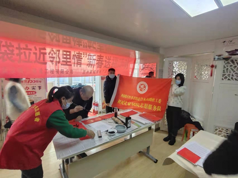 書(shū)法有行、隸、草等多種書(shū)法體,大家相互交流,相互學(xué)習(xí)。書(shū)法愛(ài)好者們將一副副飄著墨香的“?!弊炙偷骄用袷种?,同時(shí)也把祝福和溫暖送到每位居民的心坎上。