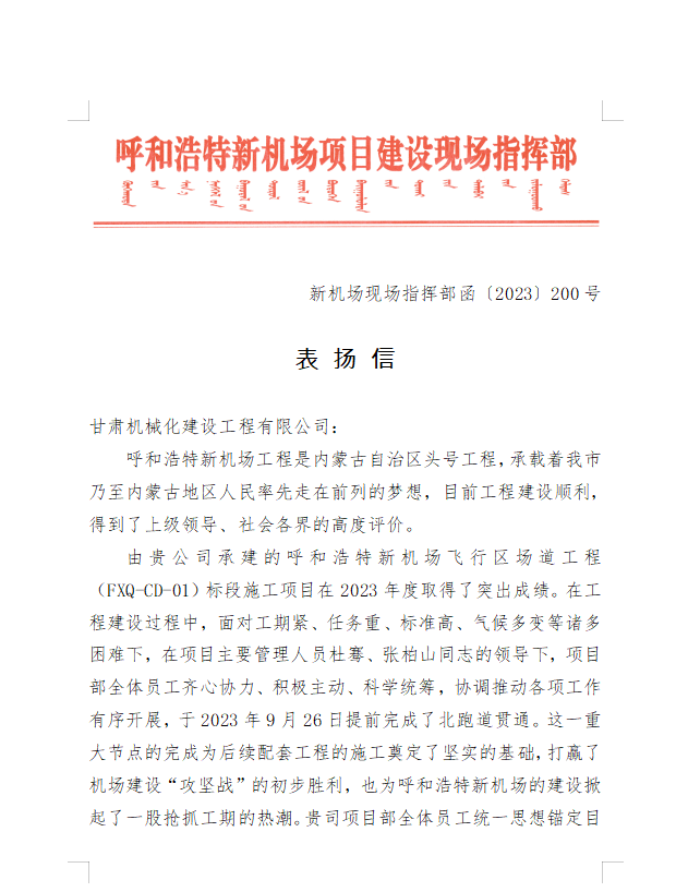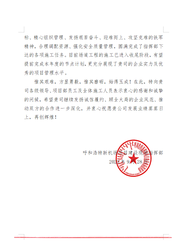 2023年9月28日,呼和浩特新機(jī)場(chǎng)項(xiàng)目建設(shè)現(xiàn)場(chǎng)指揮部給我司發(fā)來表揚(yáng)信,信中充分肯定了我司在呼和浩特新機(jī)場(chǎng)項(xiàng)目建設(shè)中項(xiàng)目部全體員工統(tǒng)一思想錨定目標(biāo)、精心組織管理、發(fā)揚(yáng)艱苦奮斗、迎難而上、攻堅(jiān)克難的鐵軍精神,合理調(diào)配資源、強(qiáng)化安全質(zhì)量管理,圓滿完成了指揮部下達(dá)的各項(xiàng)施工任務(wù)。
